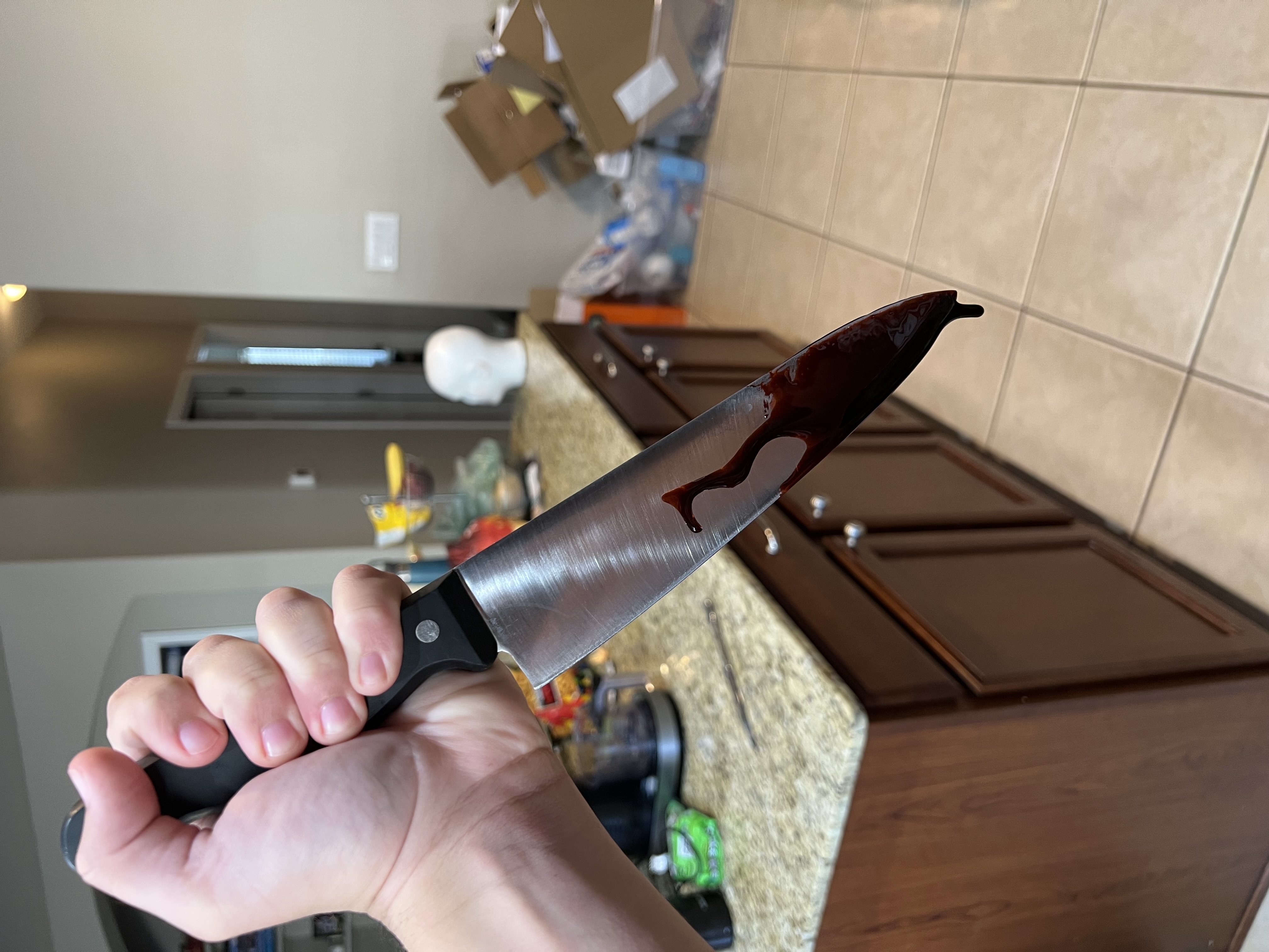 Before filming I must create blood for prosthetics and practical effects. To create blood I have gotten corn syrup, and various food coloring packets (primarily red). I mixed red food coloring into a corn syrup base, and added green and yellow food coloring, and mixed it well. The resulting practical blood had a very realistic thick consistency, and very realistic color. I am extremely happy with how it has turned out, and it will be moving onto the final cut. Here is a video of the practical blood.