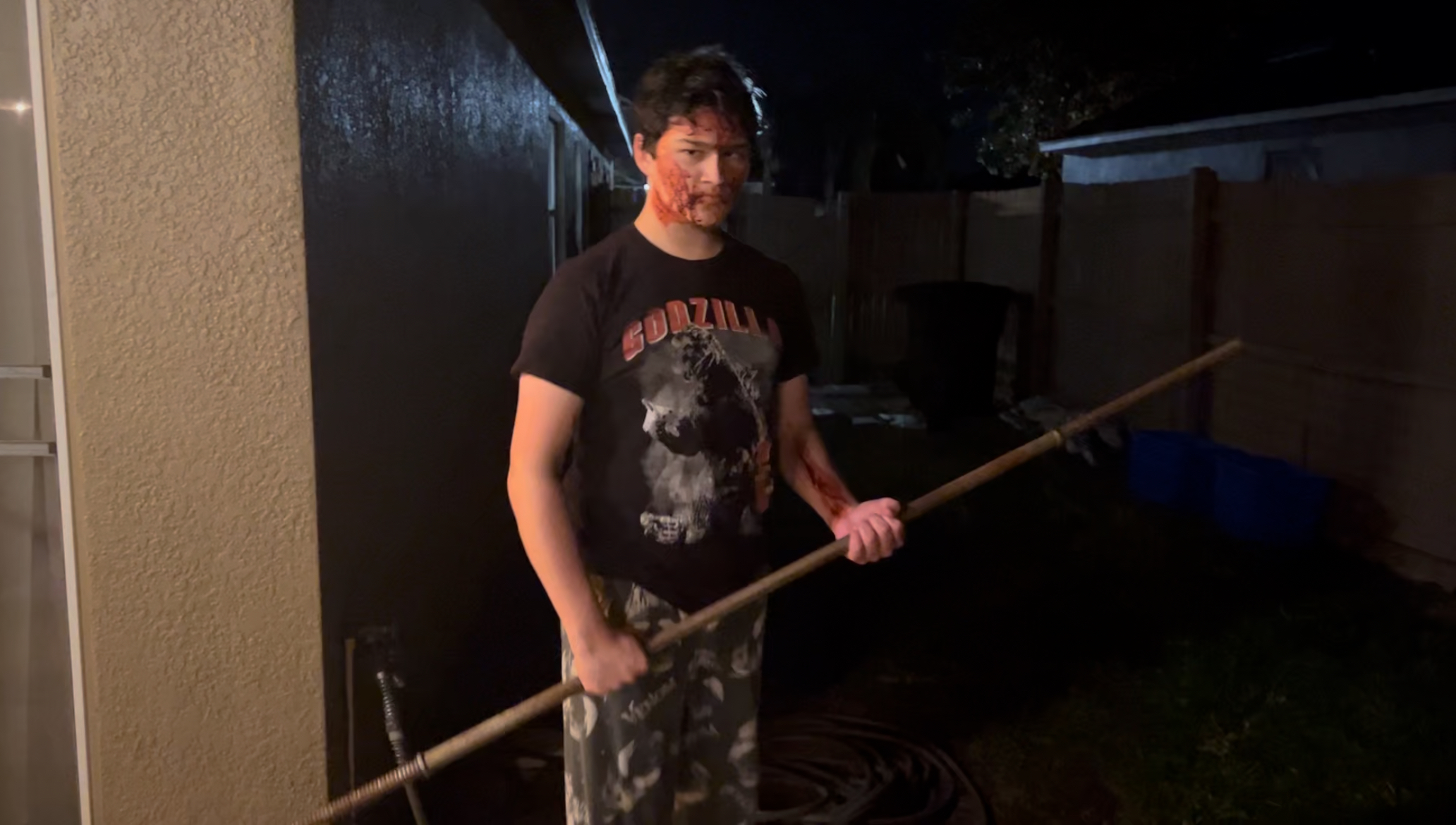 As you can see, I stayed very true to the concept art, especially in the blood application on Blair (See how I created fake blood for prastetics and practical effects in Blog Post #39). I decided to change Blair's outfit from black sweat pants, to pajama pants, to make his character look even more relaxed and set back, to create his switch to Lord Dajti Karabash even more surprising and make the character look even more un-suspectful to the audience. I also changed Blair's shirt from Evil Dead 2 to Godzilla, as I needed an older shirt, that I don't wear much anymore, and is not a very expensive shirt. This meant I couldn't include the Evil Dead 2 referance as Blair's shirt, so in Scene 2, I put Evil Dead 2 on the tv in the background.